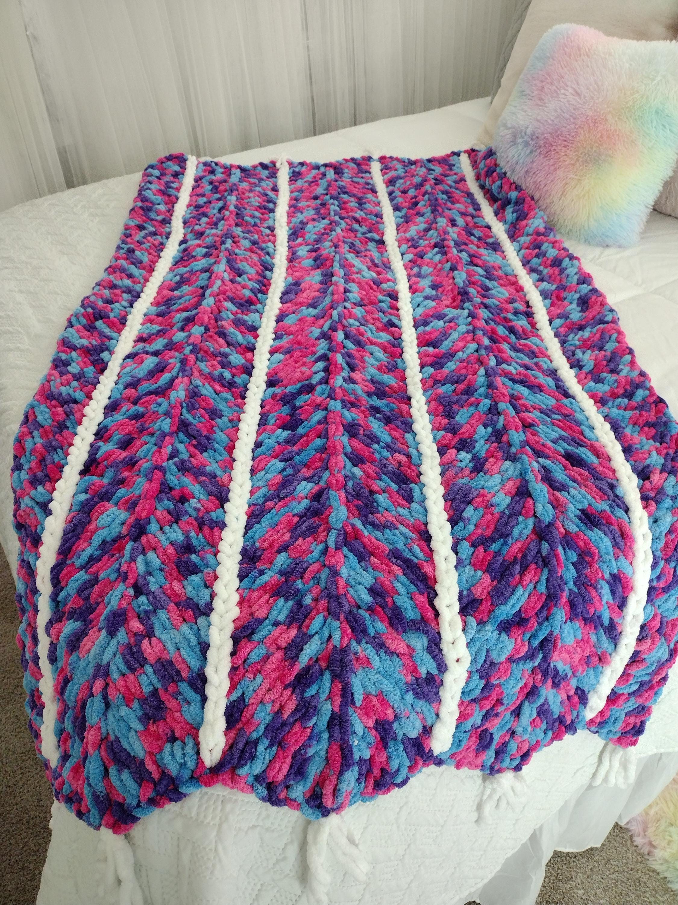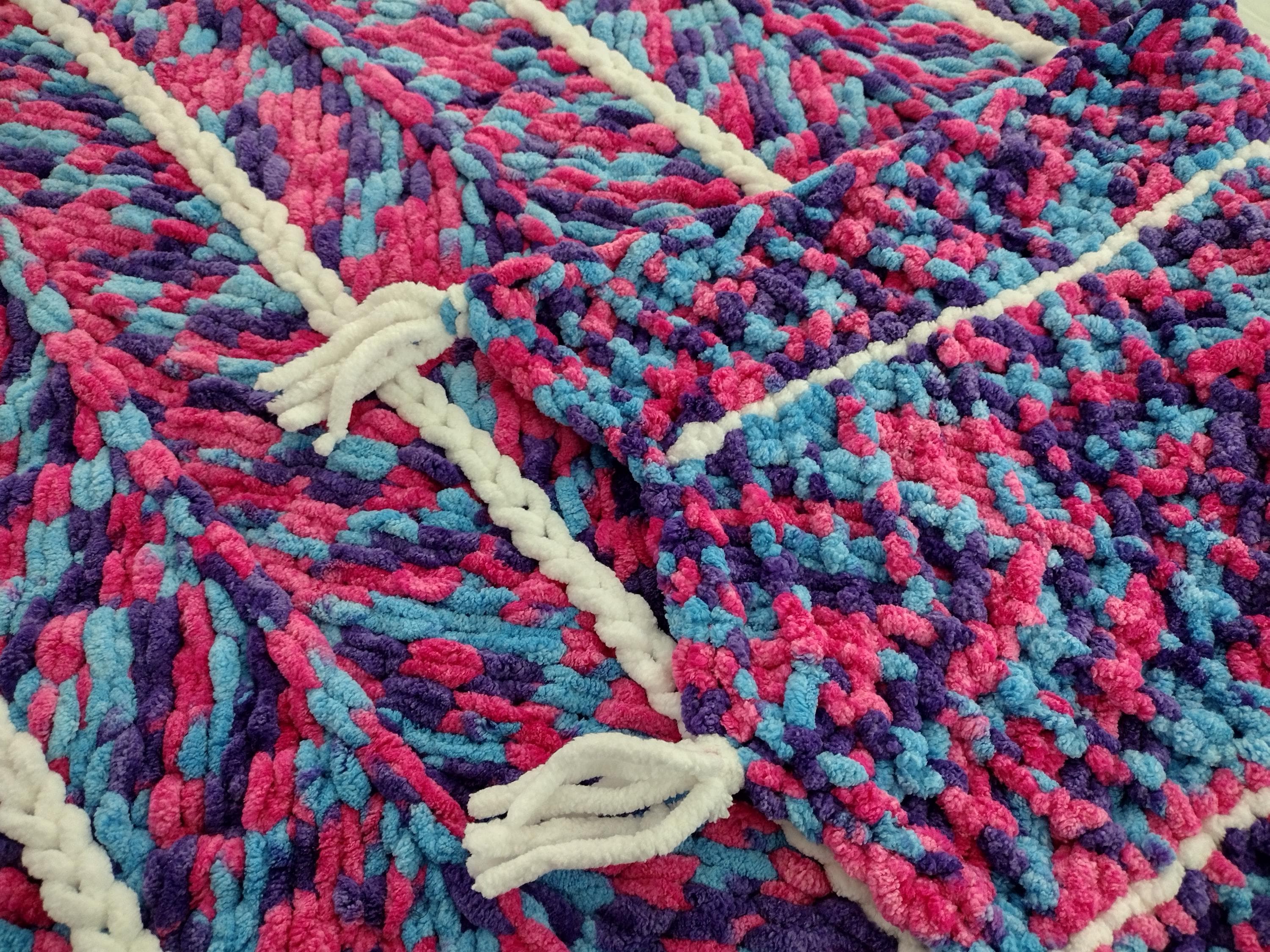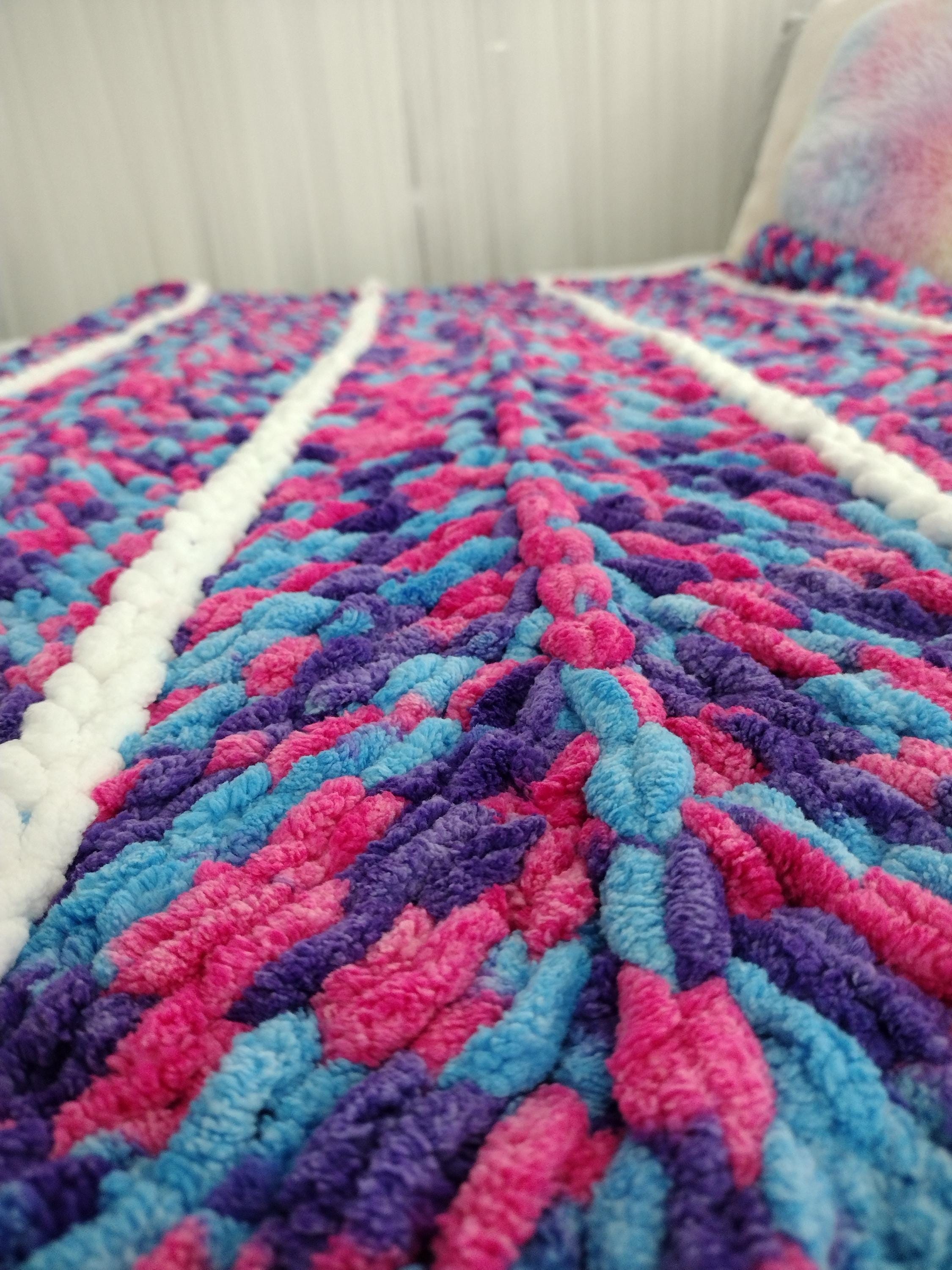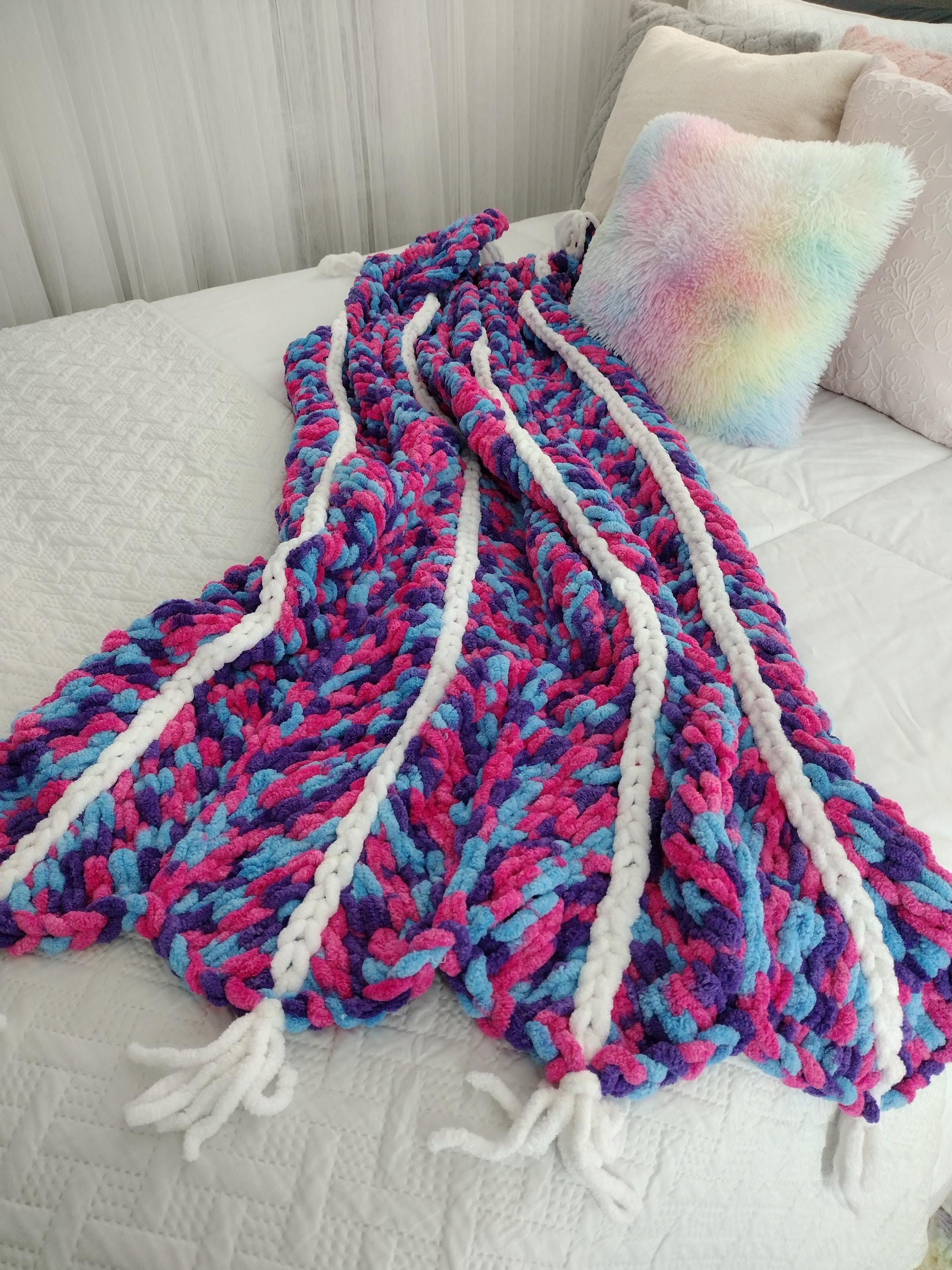 Cute and adorable chevron style hand knit blanket. Mermaid theme with a mix of hot pink, purple and blue in a hand knit chevron pattern. Solid white border and stripes down length of blanket. Bring a little sparkle and magic home!
