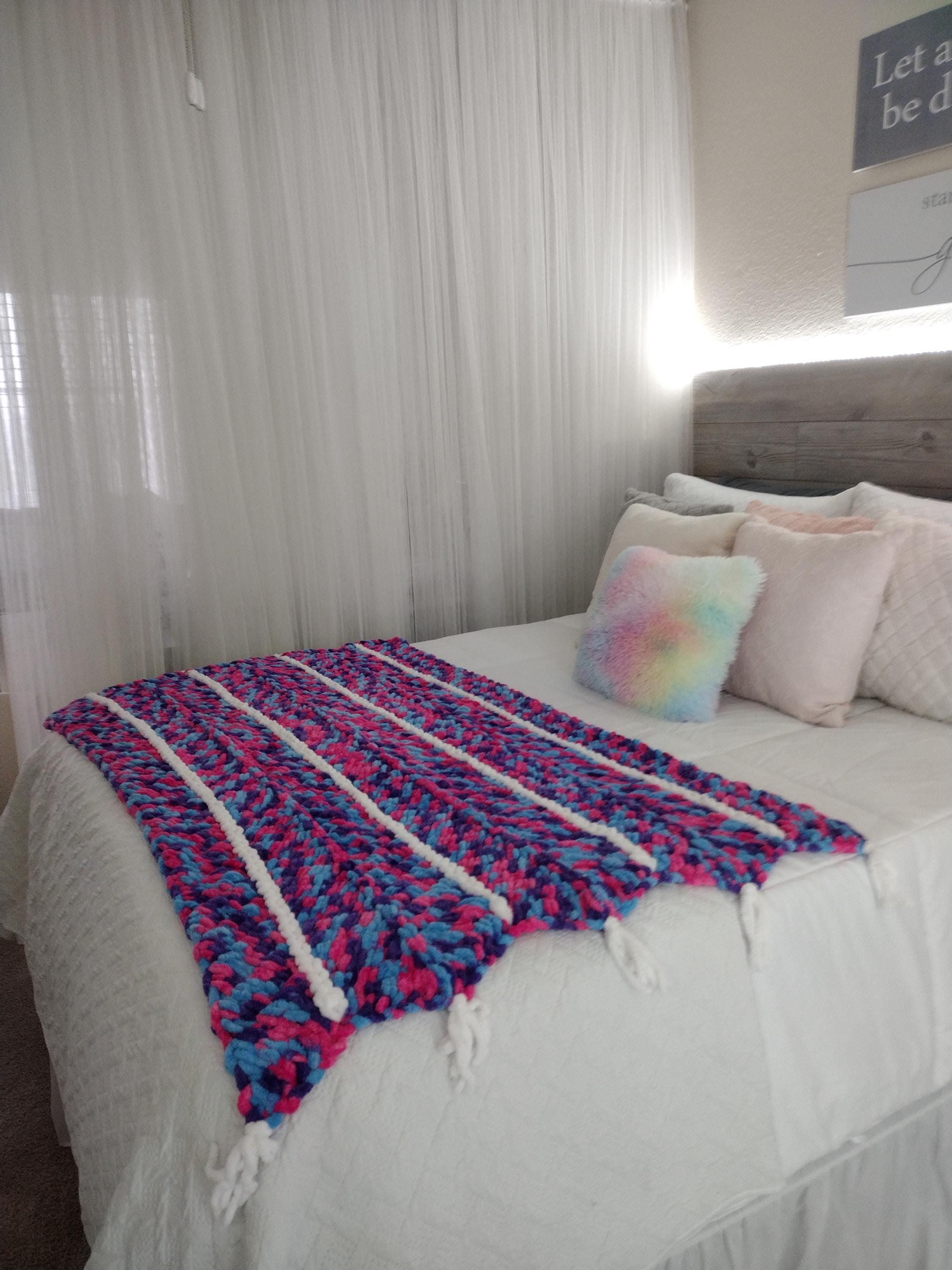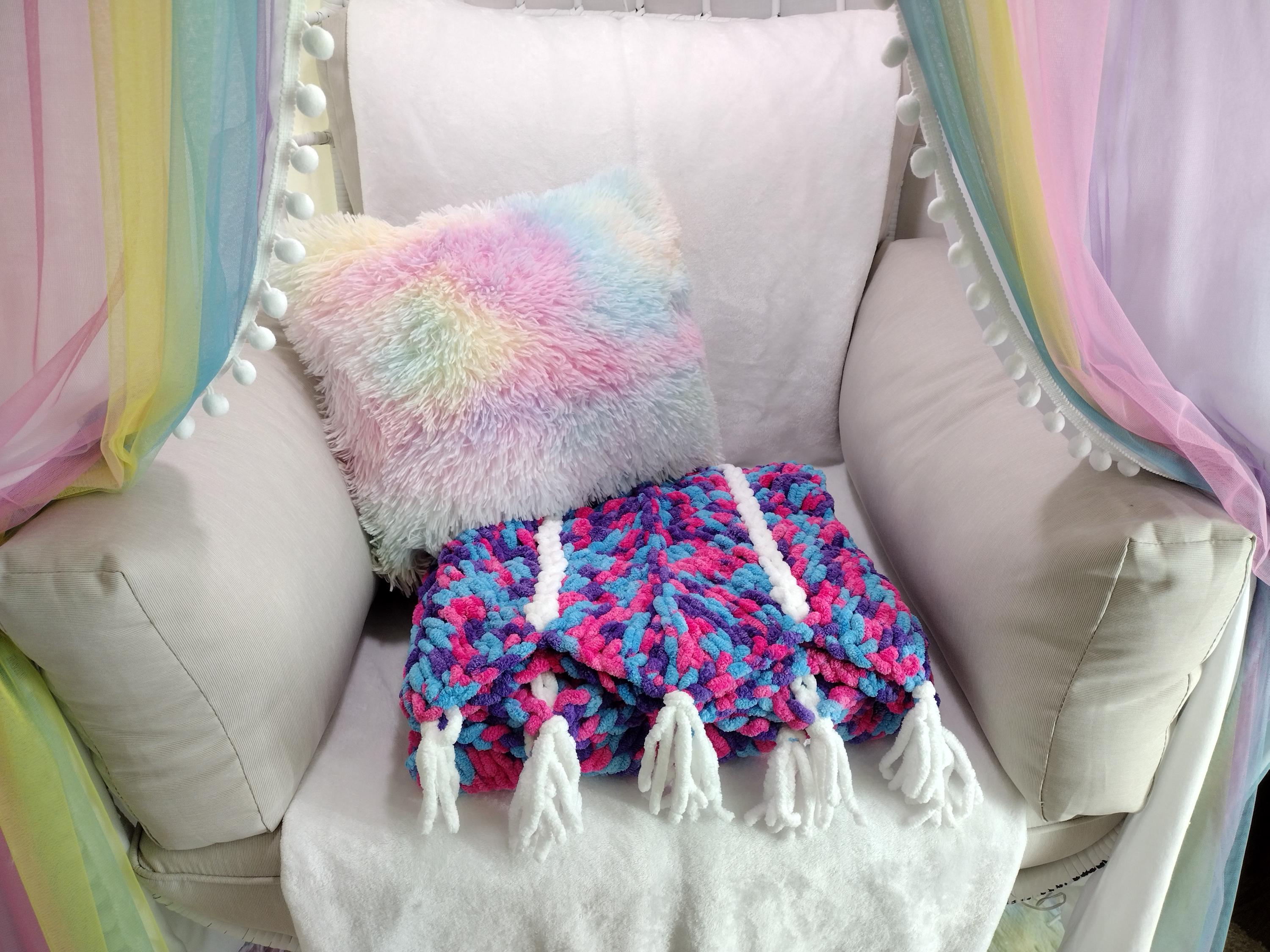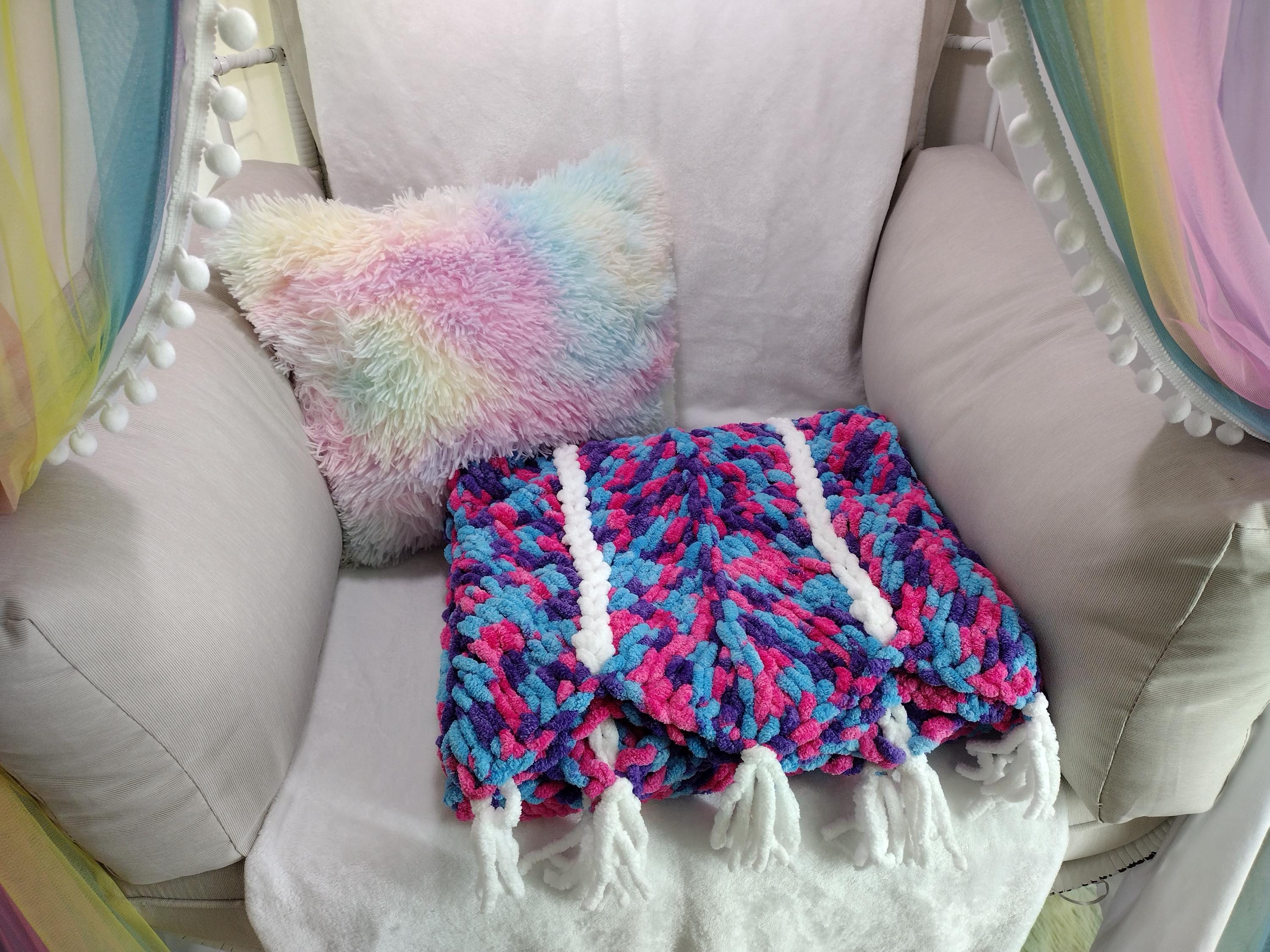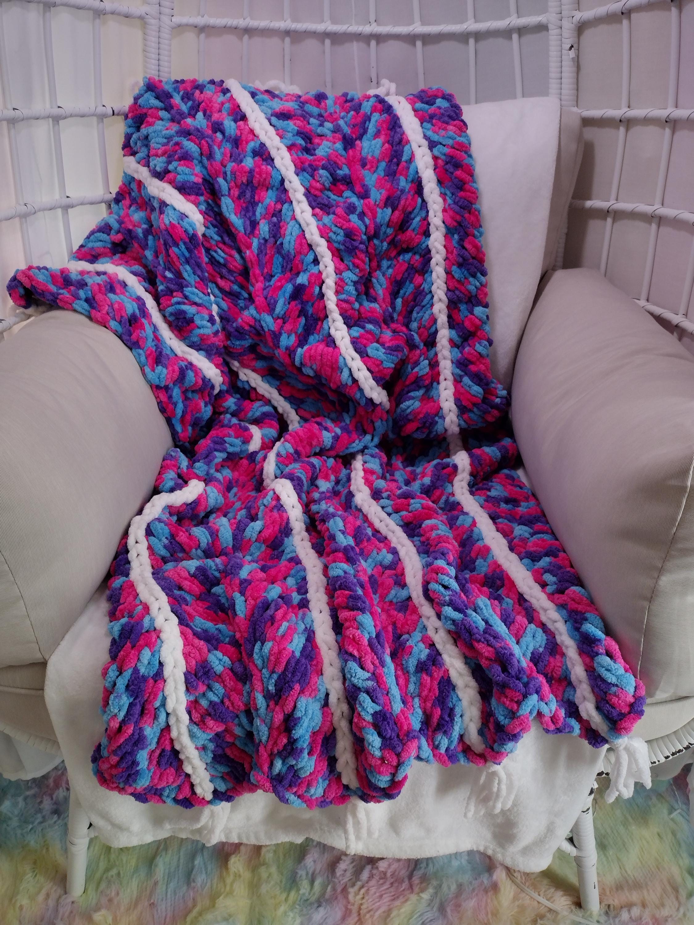 Cute and adorable chevron style hand knit blanket. Mermaid theme with a mix of hot pink, purple and blue in a hand knit chevron pattern. Solid white border and stripes down length of blanket. Bring a little sparkle and magic home!