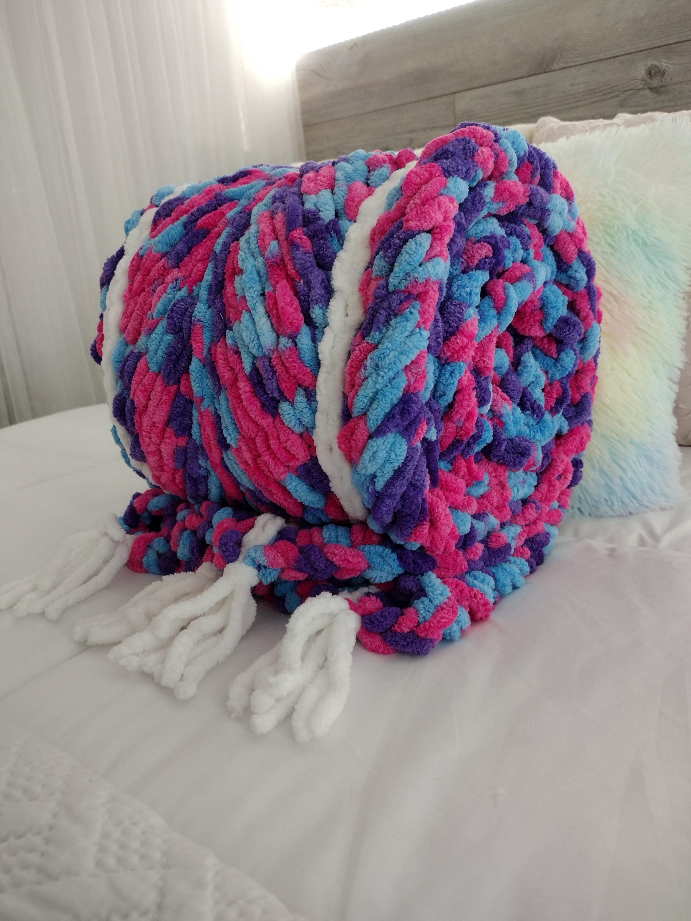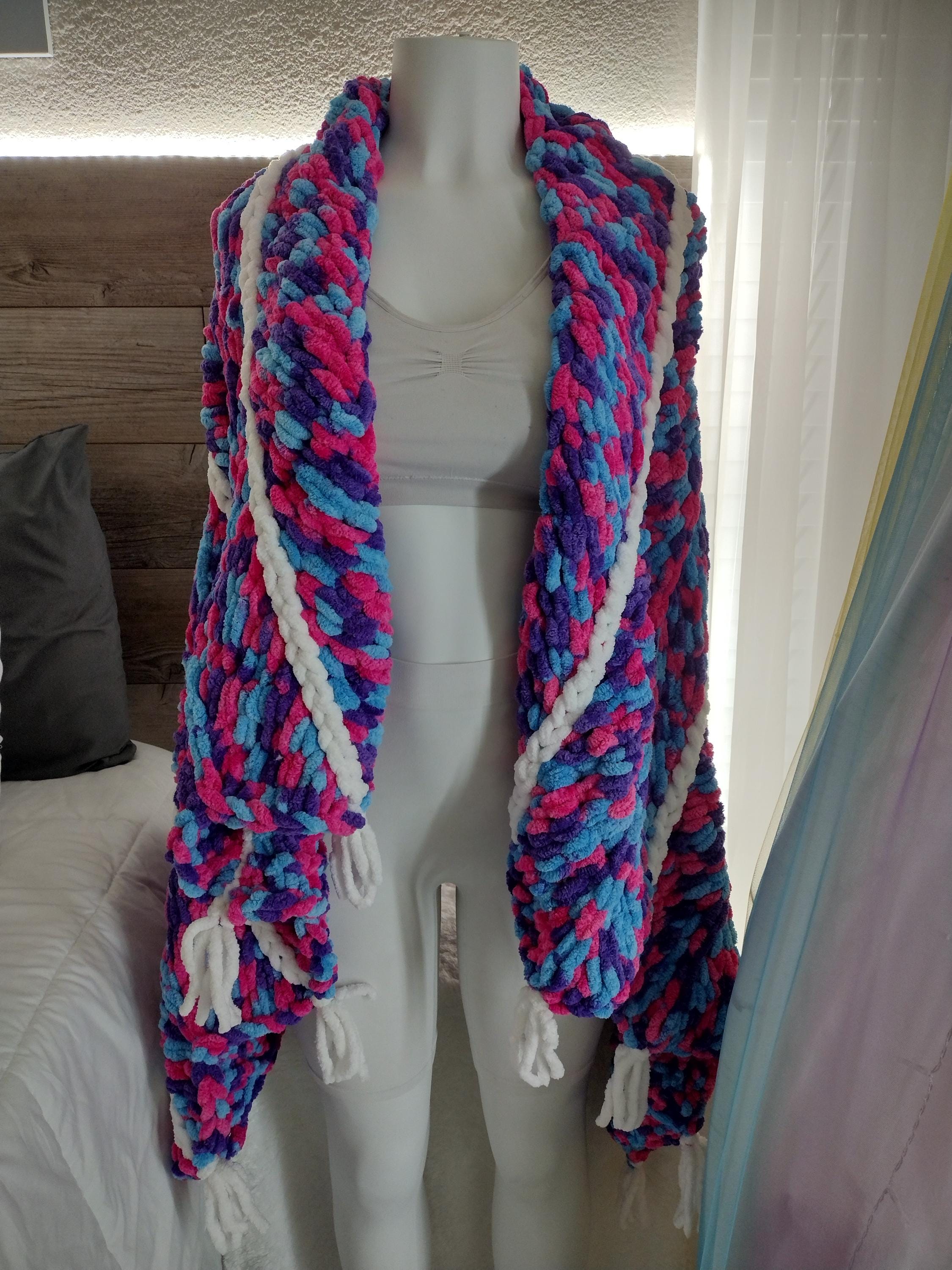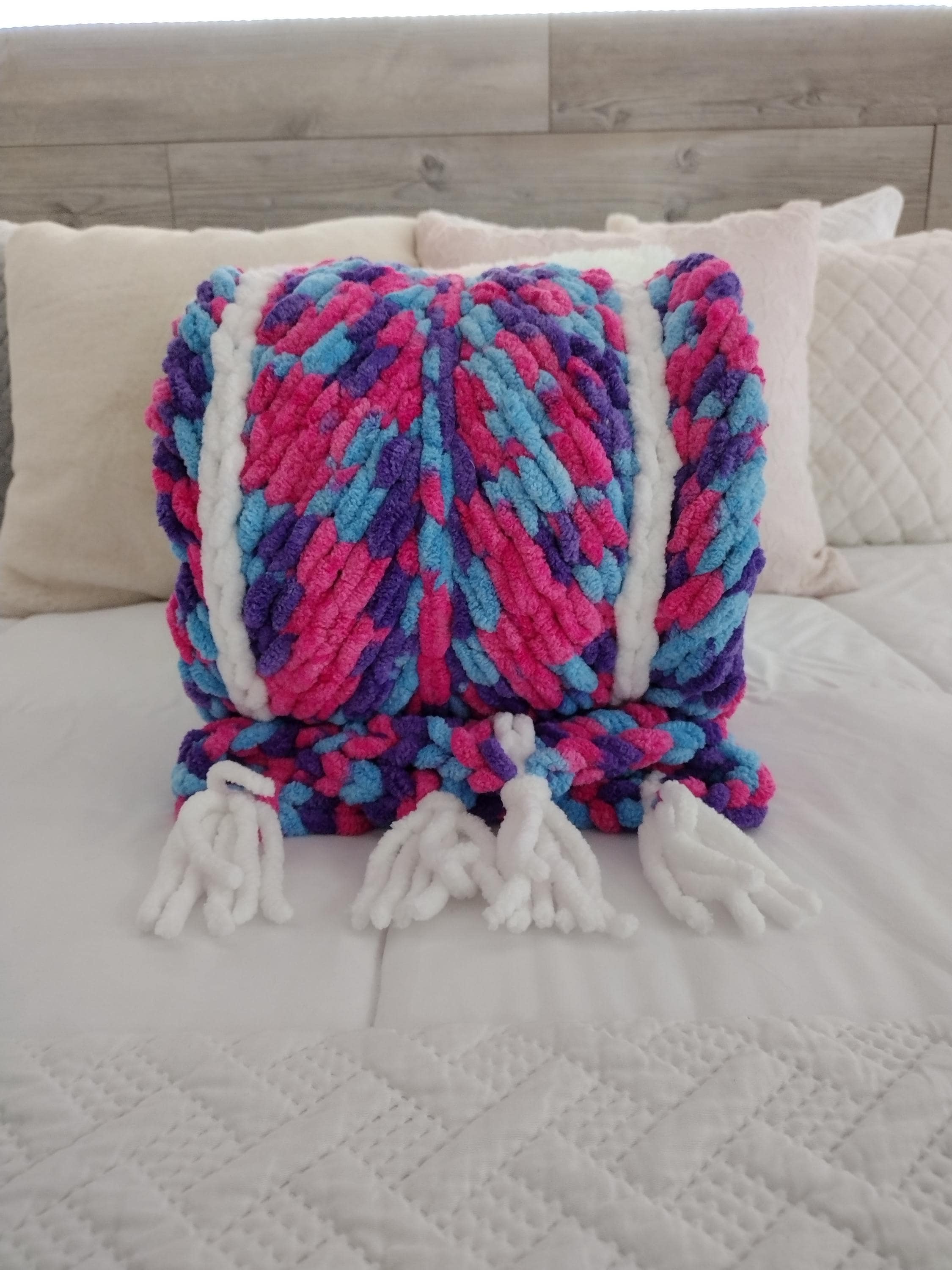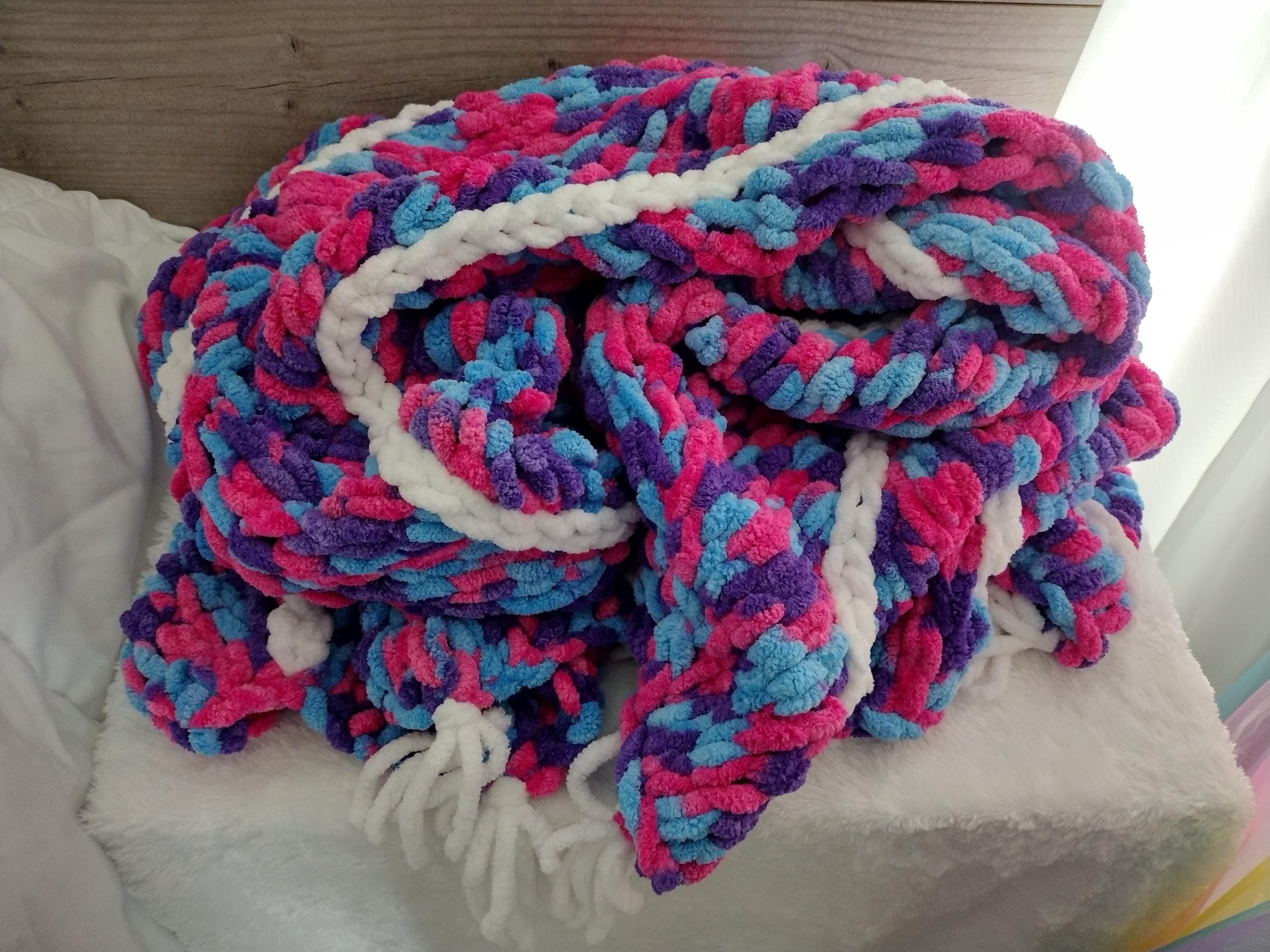 Cute and adorable chevron style hand knit blanket. Mermaid theme with a mix of hot pink, purple and blue in a hand knit chevron pattern. Solid white border and stripes down length of blanket. Bring a little sparkle and magic home!